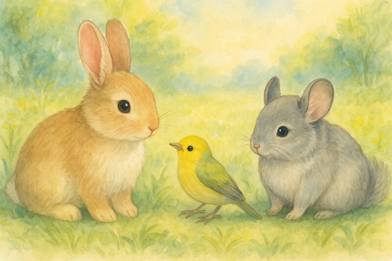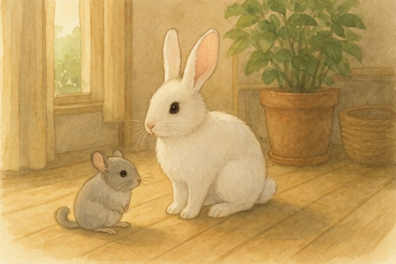 チンチラは草食で音も静か、性格も穏やか。うさぎと同じように「安心できる隅」を好むため、生活リズムや感性がとても似ています。